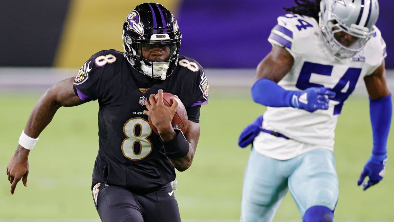 One drive after getting intercepted, Jackson faced a fourth-and-2 and trailing 3-0. He faked the handoff to running back J.K. Dobbins on a run-option, causing Dallas inside linebacker Leighton Vander Esch to bite to his right and leaving a huge running lane for the reigning NFL MVP.