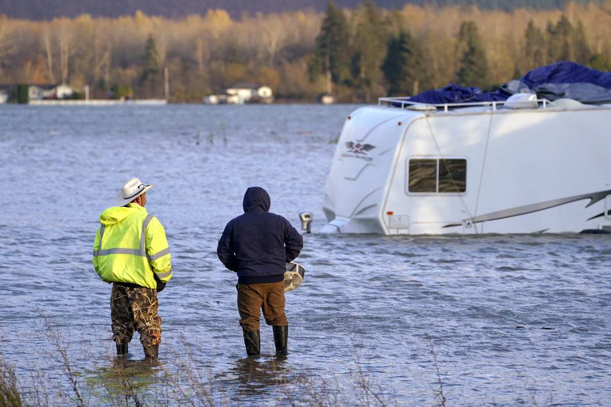 Two men look at a partially submerged recreational vehicle in the flood-swollen Skagit River in Sedro-Woolley, Wash., on Monday. Elaine Thompson/AP